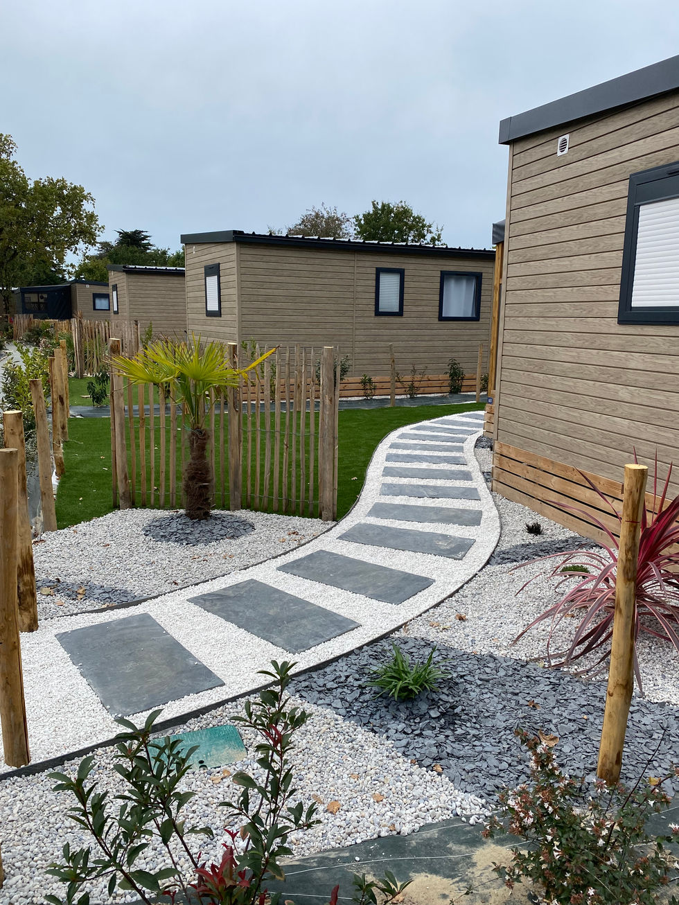 Aménagement complet d'une parcelle de mobil home : Allée, gravier, clôture, terrasse en dalle de béton pressée, gazon synthétique..
